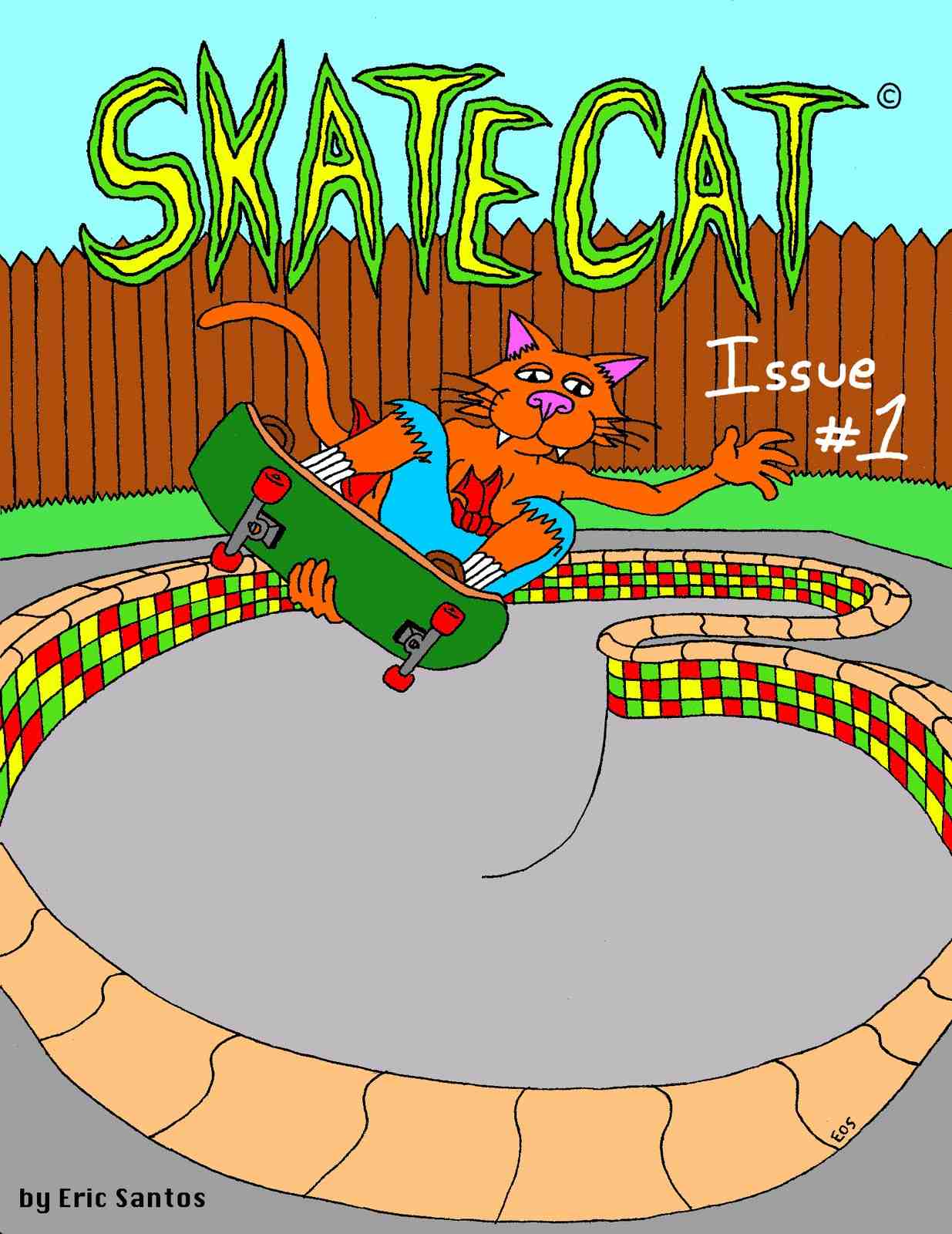 Eric Santos, Zine creator and fellow skateboard blogger recently got some press in Thrasher for his SkateCat zine. I tracked it down and really got jazzed on it. Nothing to wild, just a cartoon cat ripping in some pretty fantastic situations. Fantasy skateparks, NYC lofts, and lots of empty pools. (SkateCat doesn’t like water in the pool.)