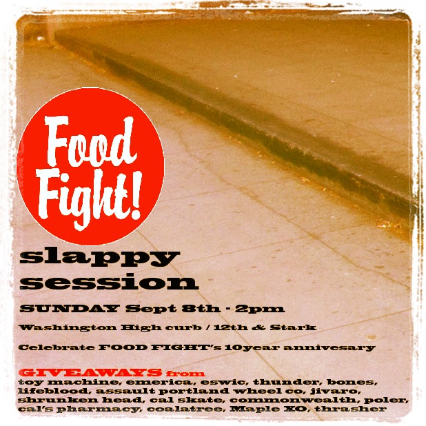Food Fight Grocery turns 10 this Sunday! (September the 8th) To celebrate, their having a potluck in the field across from the Vegan MiniMall! In conjunction, a Slappy Session Curb Contest will be going down, (low to the ground grinds for the non-skaters) and PAL (Portland Animal Liberation) will be making posters for an up-coming circus protest!