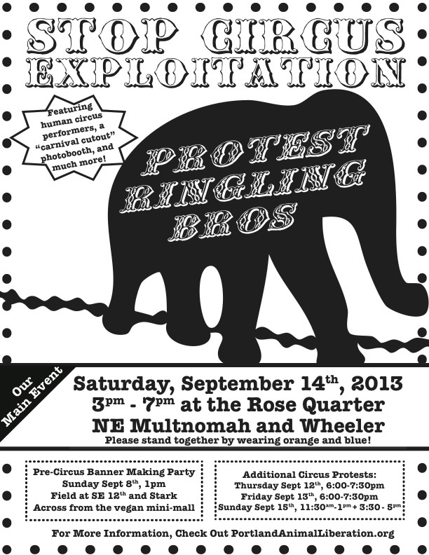 Portland Animal Liberation will be making posters at 1pm for their upcoming protest of Ringling Bros. Circus. If you want to do more for the animals then stuff your face with tofu, this is your chance to be constructive while your belles settle for whats up next.