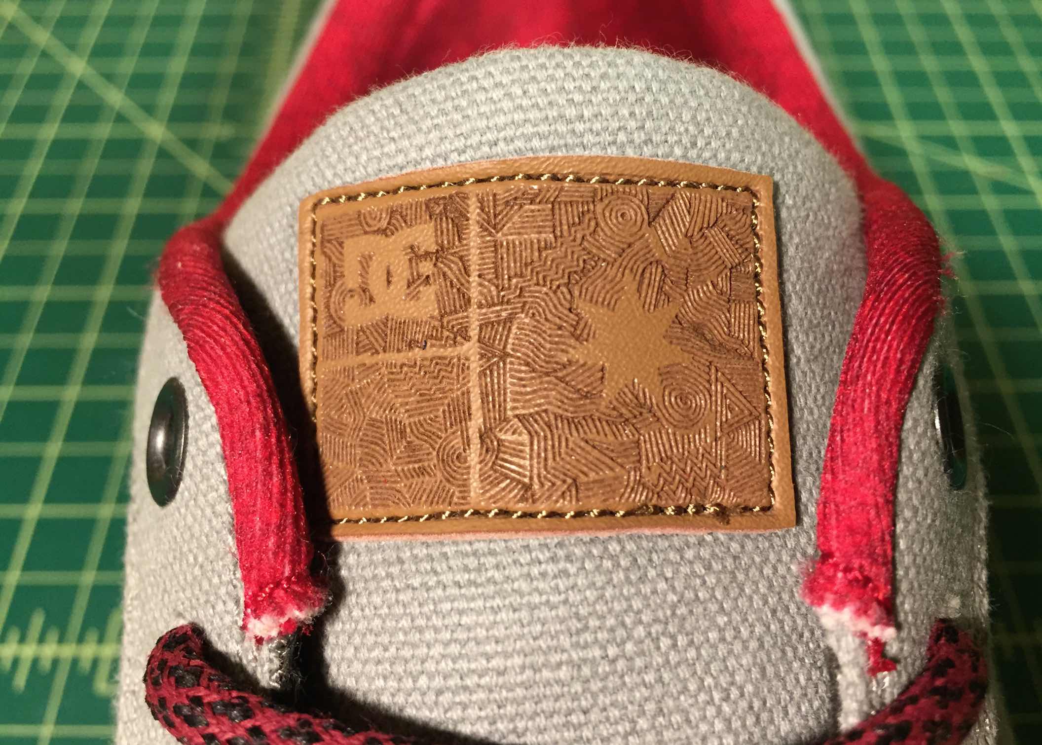 Brandon Spiegel is a studio artist from Southern California. His work is primarily repeated line work that create labyrinth like patterns. His designs provide the detail on the shoe. The tongue patch here is a faux-leather imprinted with design and the DC Logo and star.