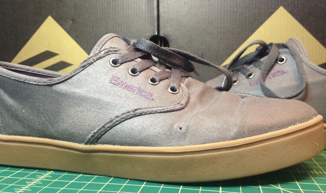 The gum cupsole treads look typical to most of the Emerica current lineup. A bit thinner then you might normally find with a cup but they have great flex. Opposite of the Jinx, no break-in time is needed here. Slip them on, and jump on the board. The EVA footbeds are super cushiony for the thinness. I took them down a few stair sets and felt fine, which for 31 is saying a lot. If you have doubts, check out just about any photos of Figgy in the last three years. He takes 12 sets in the Laced on the reg. (if only his model was Vegan.)