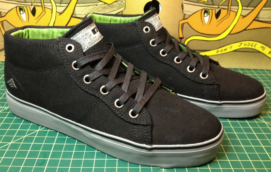 The laces already in the shoe are stiff made from a tough material that has shipped with previous Etnies Eco models. However, if you like a traditional lace, the green model has some extra green while the black has gray laces to match the outsole.
