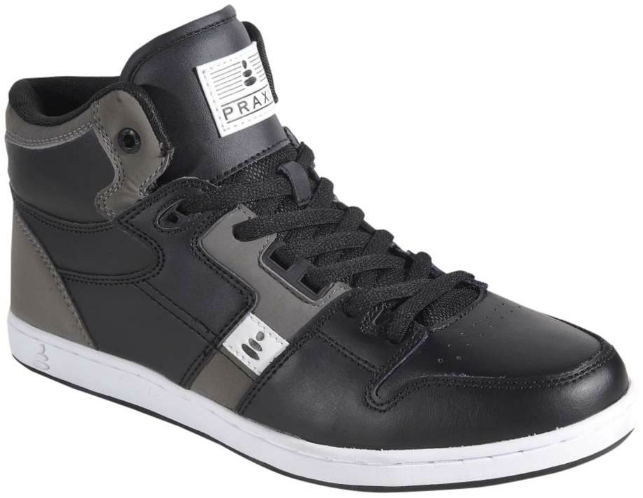 Praxis Freestyle Vegan Skateboard shoe synthetic-leather synthetic-nubuckFreestyle is the second hi-top from Praxis and this one comes in an all synthetic-leather upper! Not as loud as the Vegan Elemental, this is a combo of a black-synthetic leather on a grey synthetic-nubuck.  The lace cage features a few plastic loops for fast lacing, and a handy eyelet to keep the tongue straight.  The tongue is thinly padded, while the collar gives plenty of ankle protection. Praxis’ “Sacred Sole” cupsoles are super thin and responsive! You get the comfort of a cupsole with the feel of a thin vulcanized shoe.