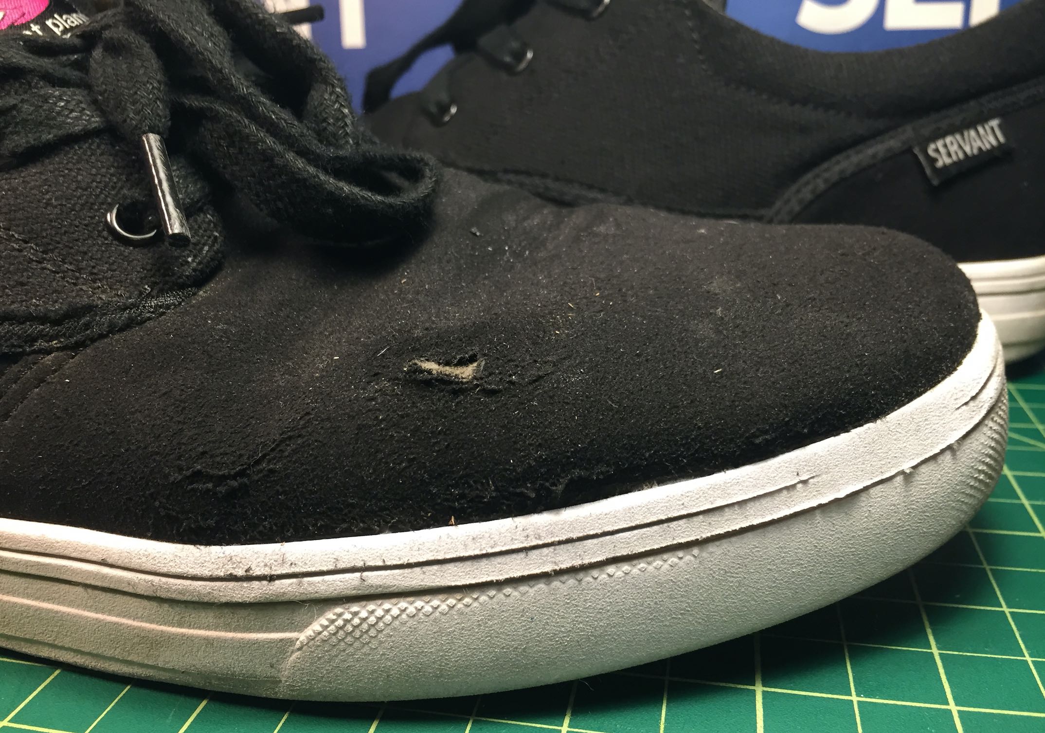 Another week after the first whole started to open up, its a gaper! Servant makes a hell of a shoe and the Loiter Barnyard held up much longer then any other shoe we have reviewed, aside from the Servant Dagon which has a bit more lining in the toe. In total the shoe was skated for nearly 10 weeks total!