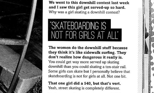 Not only was the interview in Thrasher dismissive about women’s ability to decide whether or not they want to get “served-up”, Phelp’s comment about “that one girl did a 540 but that’s vert” doesn’t even recognize “that girl” has a name and that Alana Smith’s skateboarding has influenced many, many other skaters. Whether or not it was in vert is in my opinion irrelevant, as the comment is characteristic of a larger attitude in skateboarding, and I’ve heard the same ignorant things said about women in street. For instance, not that long ago on Facebook I saw a post from a well known Canadian skateboard photographer about whether or not Leticia Bufoni had the right to make money from a Secret Deodorant advertisement. Again, she was “some girl” making money off of skateboarding by getting paid by some corporation that has nothing to do with skateboarding, and therefore was controversial and somehow not a true skateboarder. Not only did he have no idea how talented she is and that she’s one of the best women in street skating, he also seemed totally oblivious about how hard it is for women to make a living from skateboarding. So called “core” or “skater owned and operated” magazines and companies are routinely uninformed and often exclusionary.