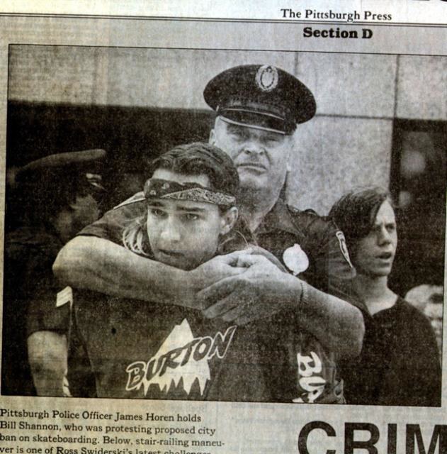 Then as skateboarding started to catch on, (Pittsburgh) City Council announced they were going to ban skateboarding. And so we decided to go to the hearing and protest. Then we found out that the people behind it were the Squirrel Hill Business group, sort of the upper class wealthier people in Pittsburgh. So these kids, their own kids are skateboarding in front of their stores, marking up their curbs, spitting on the side walk. And they just wanted to get rid of this nuisance. They wanted their shoppers to feel safe, and here are these kids with black bandannas and spikes on, spitting and swearing and they’ve got skateboards. They were pushing this ban, so when we found out they were having this big side-walk sale in Squirrel Hill we decided that would be the perfect day to go through Squirrel Hill with our “skateboarding is not a crime” and “don’t ban skateboarding” signs. So we got a bunch of people together, probably like 20 strong and we whee all on our skateboards tearing through their sidewalk sale, where everybody had their little knick-knacks, their dresses and shoes and crap on the side walk trying to sell it. So we hit the hill, and this cop was looking for people who looked like they were directing it and I was one of the people who organized it. Me, Neil Grant and Brian Cummings had made this thing happen. So he pointed at me and motioned for me to come over to him and I just ignored him and was like, “I’m not coming over to you.” Which was stupid. If I was older I would have been like, “Yeah we’re here to protest, we’ll be done in 20 minutes, we’re just gonna make our statement and skate through.” But because I had to be a smart ass and was ignorant about how to handle cops in that kind of situation, he was super pissed off. So he jumped out of his car, chased me down, slammed me to the ground, pulled my hair, broke my neckless, ripped my shirt I mean he was mad. But there was so many people there including The Pittsburgh Press documenting the whole thing.